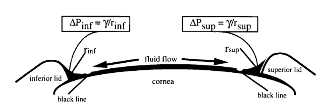 The y is the surface tension of tear fluid, r1 the radius of the curvature of the tear meniscus, and r2 is the vertical component of the radius of curvature of the meniscus strip along the eyelid. The figure shows the representation of the negative hydrostatic pressure in each tear meniscus is inversely proportional to the radius of curvature of the concave meniscus and proportional to the surface tension of the tear fluid.[29, p. 649]