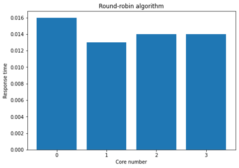 In the figure 7 the response time in each core is observable and due to the quantum time given of 0.013 seconds the valid return of the command is made in core 1, 2 and 3. After knowing the values stored, there is the attempt to execute the command a second time.