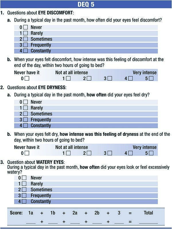[25] Chalmers, Robin L., Carolyn G. Begley, and Barbara Caffery. 2010. "Validation of the 5-Item Dry Eye Questionnaire (DEQ-5): Discrimination Across Self-Assessed Severity and Aqueous Tear Deficient Dry Eye Diagnoses". Contact Lens and Anterior Eye. 33, no. 2: 55-60.