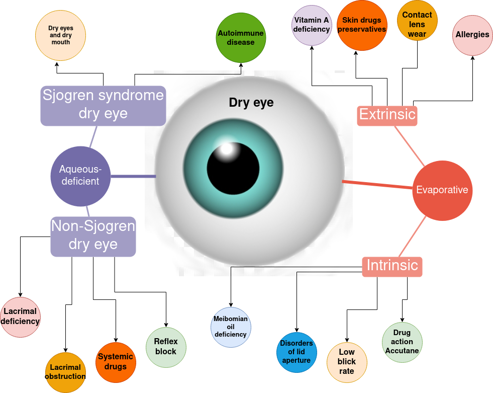 In the figure 2 are hypothetical consequences of the dry eye for aqueous-deficiency such as Sjogren syndrome that is identified by deficiency of producing lacrimal and salivary moisture where that is likely to be linked with genetics and exposure to virus or bacteria. While Non-Sjogren consequences such as lacrimal gland duct obstruction cause by aging or reflex block by the wear of contact lens and use of anesthesia. In the evaporative side as intrinsic the consequences of meibomian gland oil insufficiency, disorders on lid aperture, low blink rate and use of Accutane drug. In the evaporative extrinsic phenomenon, there is the lack of vitamin A [22, p. 303] that can be found in carrots, broccoli or cantaloupe. Also, the wear of contact lens can lower tear osmolarity. [23]